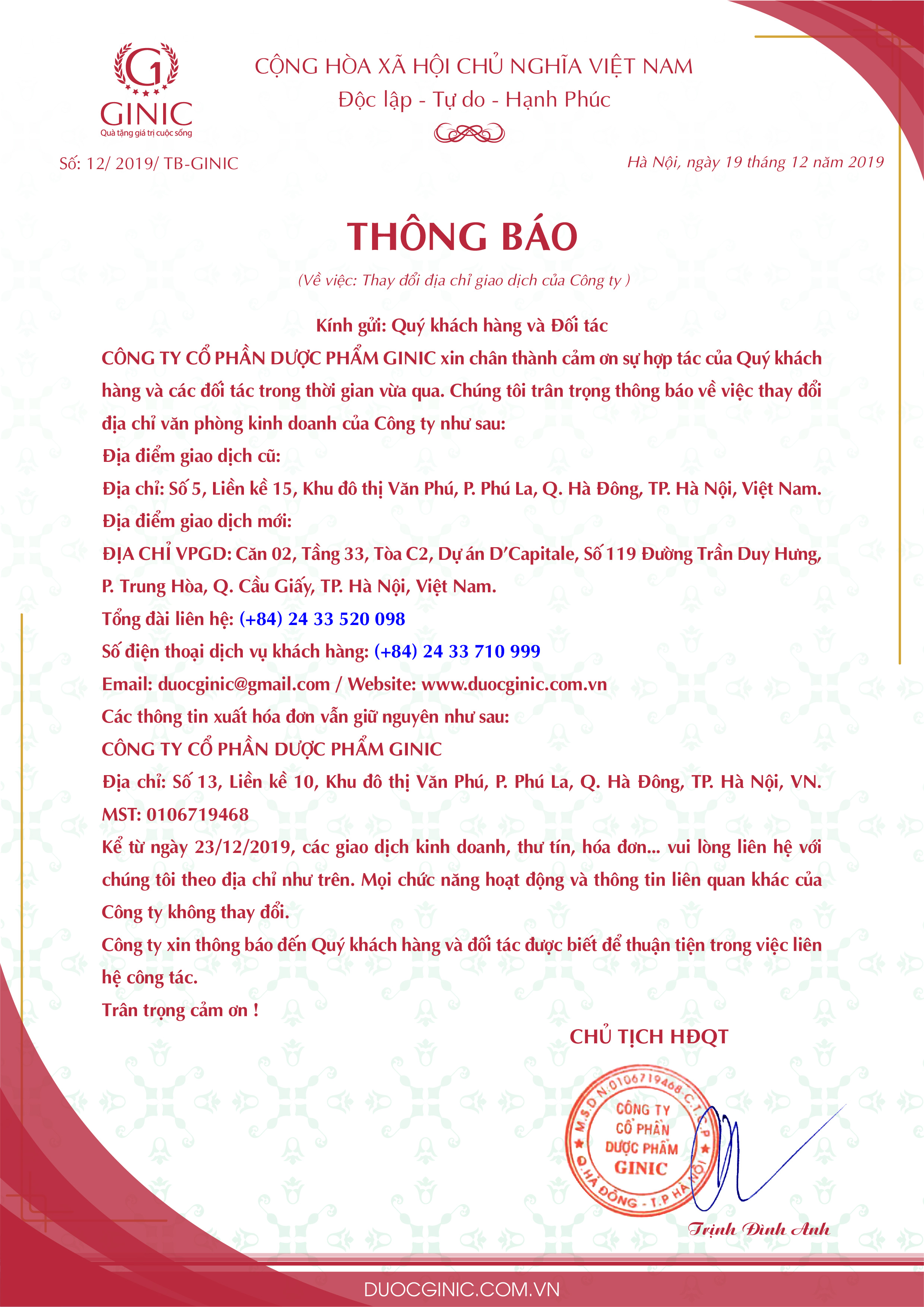 THÔNG BÁO THAY ĐỔI ĐỊA CHỈ GIAO DỊCH